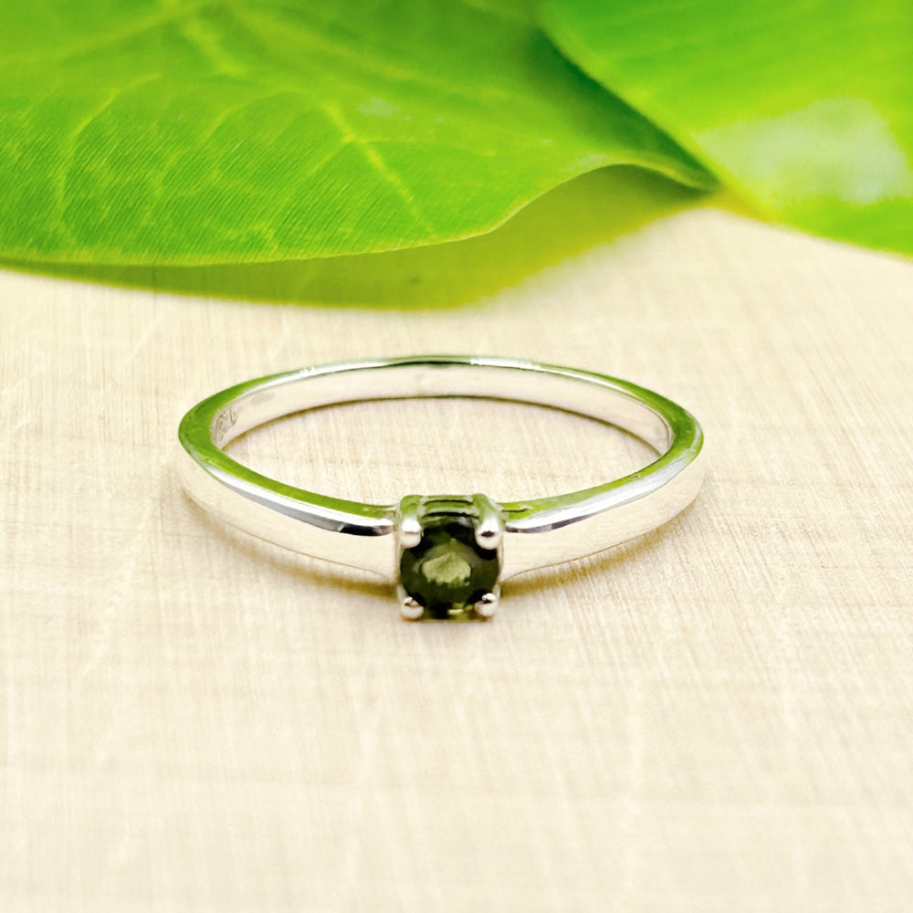 Moldavite 4mm Round Sterling Silver Ring Size 7